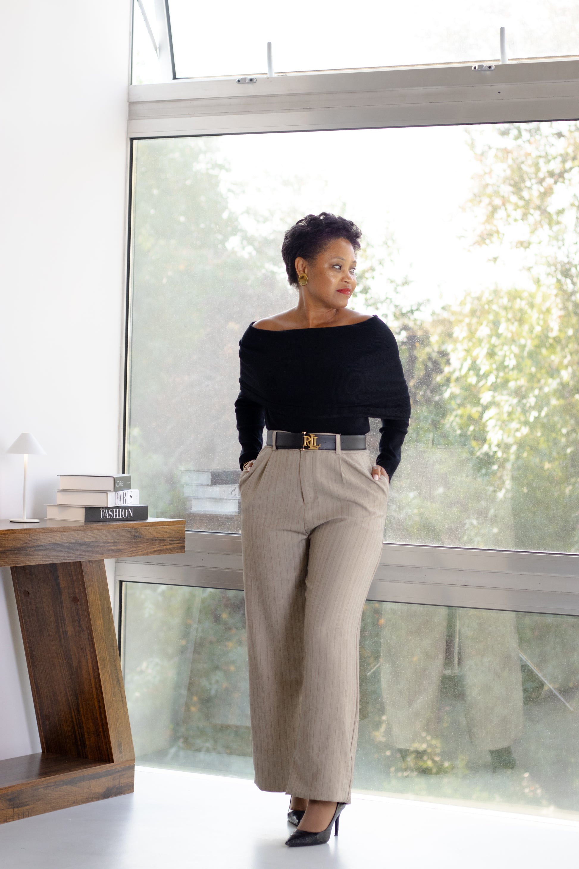 Calça de cintura alta com pregas frontais. Bolsos frontais e um bolso falso com debrum duplo atrás. Perna larga. Fecho frontal com zíper, botão interno e gancho.